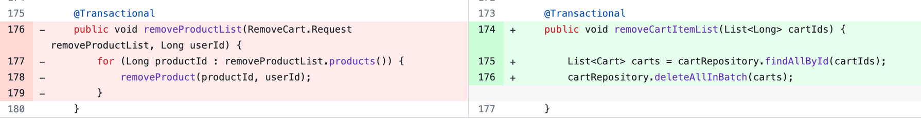 public void removeProductList(RemoveCart.Request removeProductList, Long userId) {