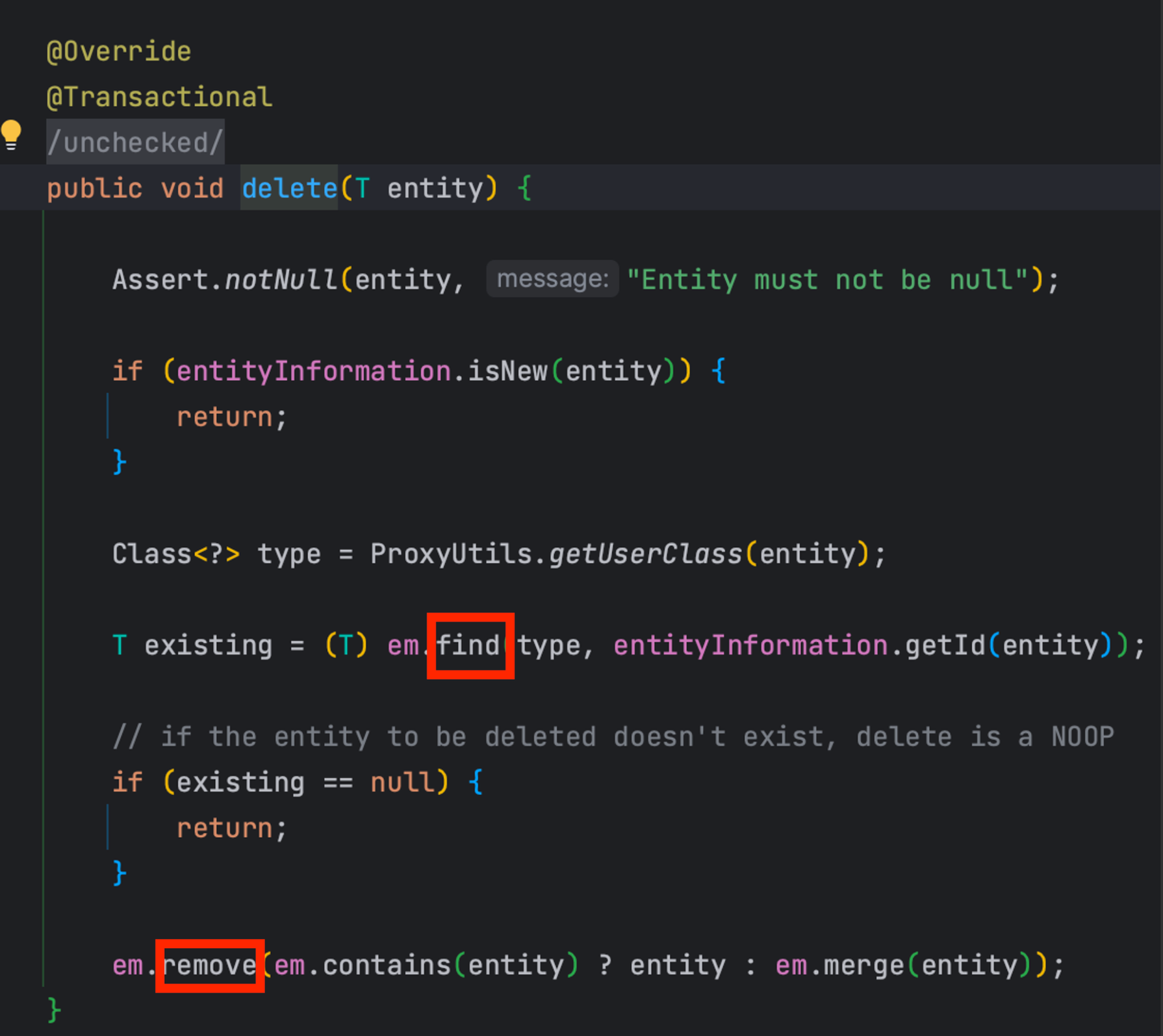 delete는 내부적으로 Entitymanger를 호출하여 find 후 remove하고 있다.