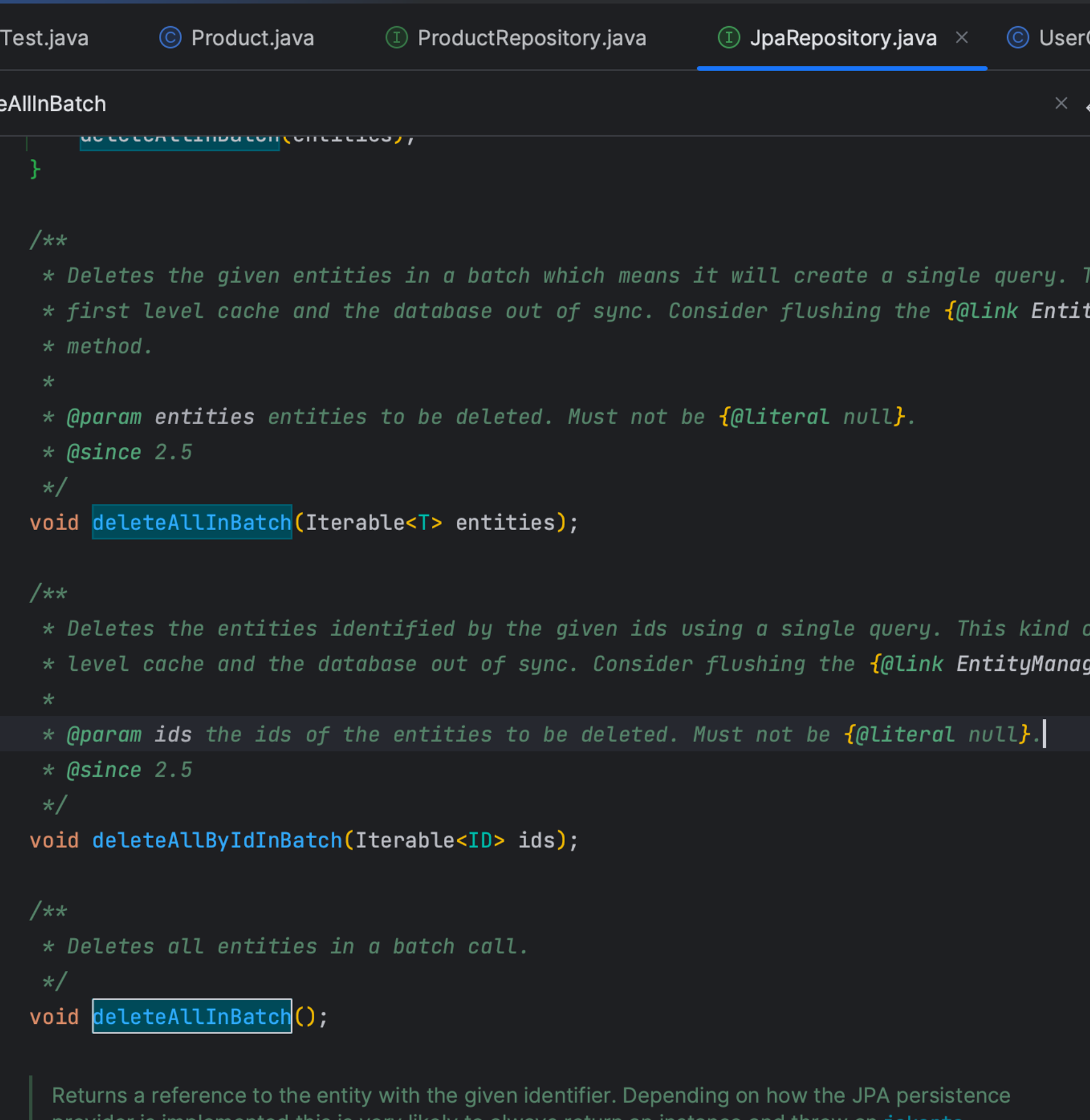 그렇다면, deleteAllInBatch는 모아서 한 번에 삭제한다는 의미로 해석이 될 수 있다.