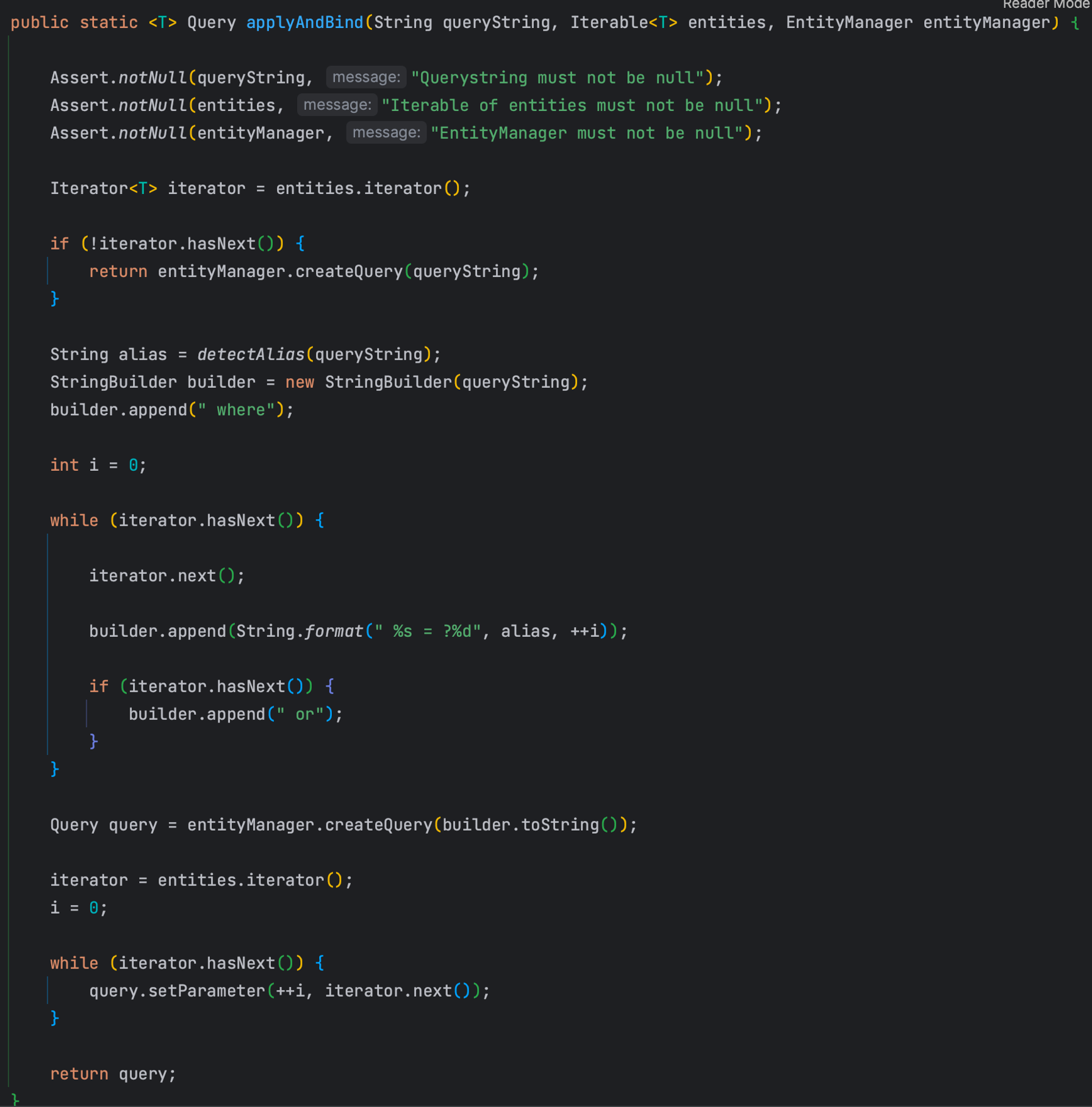 applyAndBind를 보면 반복문을 돌려서 다음 값이 있을 때 or을 붙여 데이터 갯수 만큼 추가한다.