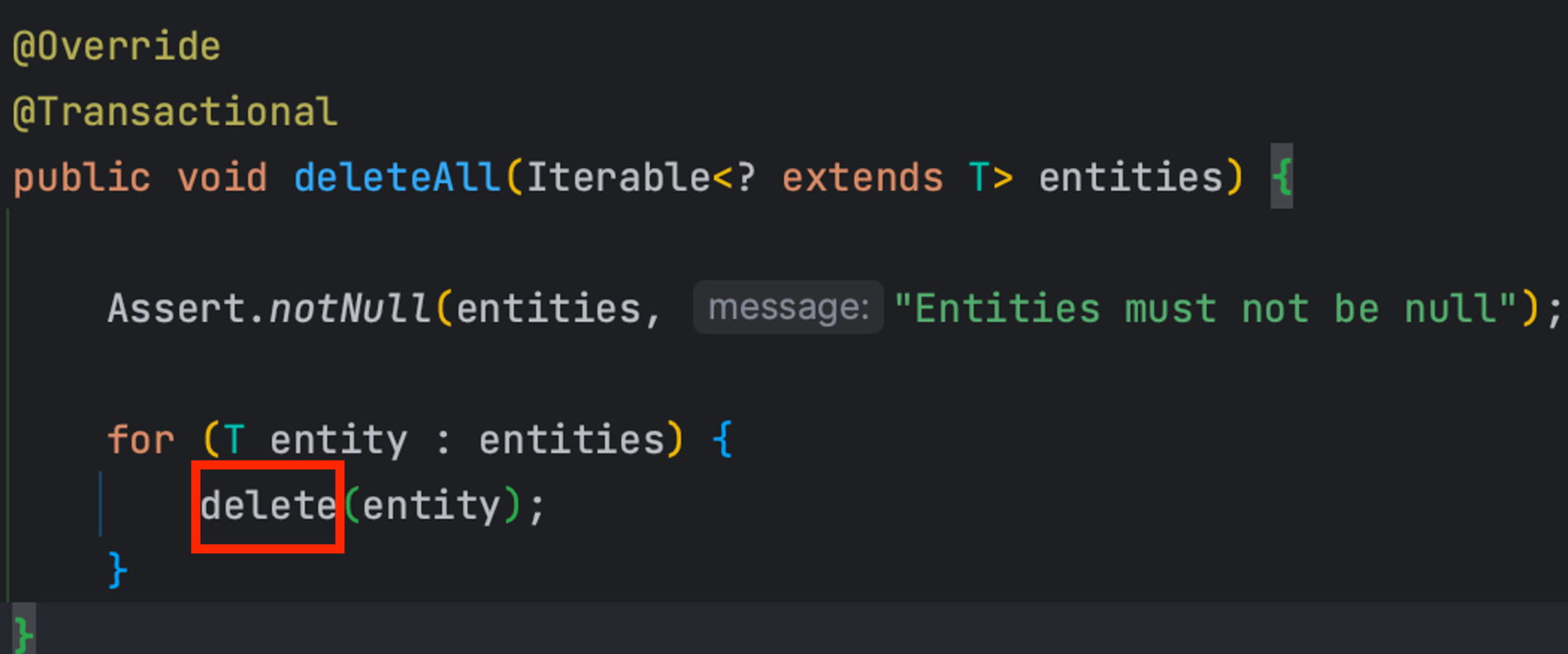내부에 entity 하나씩 반복문을 돌며 delete를 호출하고 있다.