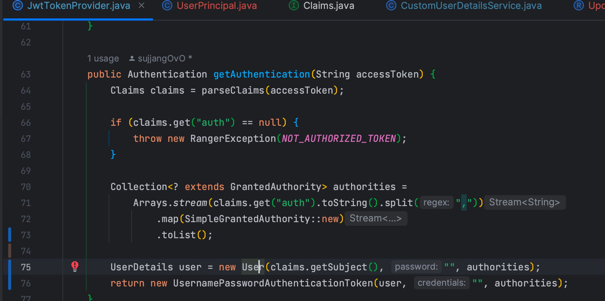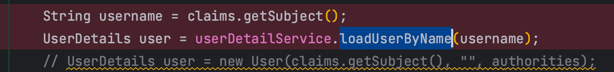 위의 코드를 보면 맨 처음 문제가 있던 코든데 User를 새로 만들어서 반환값에 넣어 반환하기 때문에 기존의 유저를 찾지 못하는 상황이다.(new User(claims.getSubject(), “”, authorities))