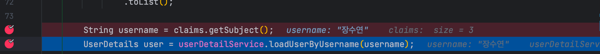 혹시나..? 하고 username을 디버깅 찍었을 때 계속 email이 아닌 name으로 사용자를 식별하고 있는 것이었다… username = “장수연”