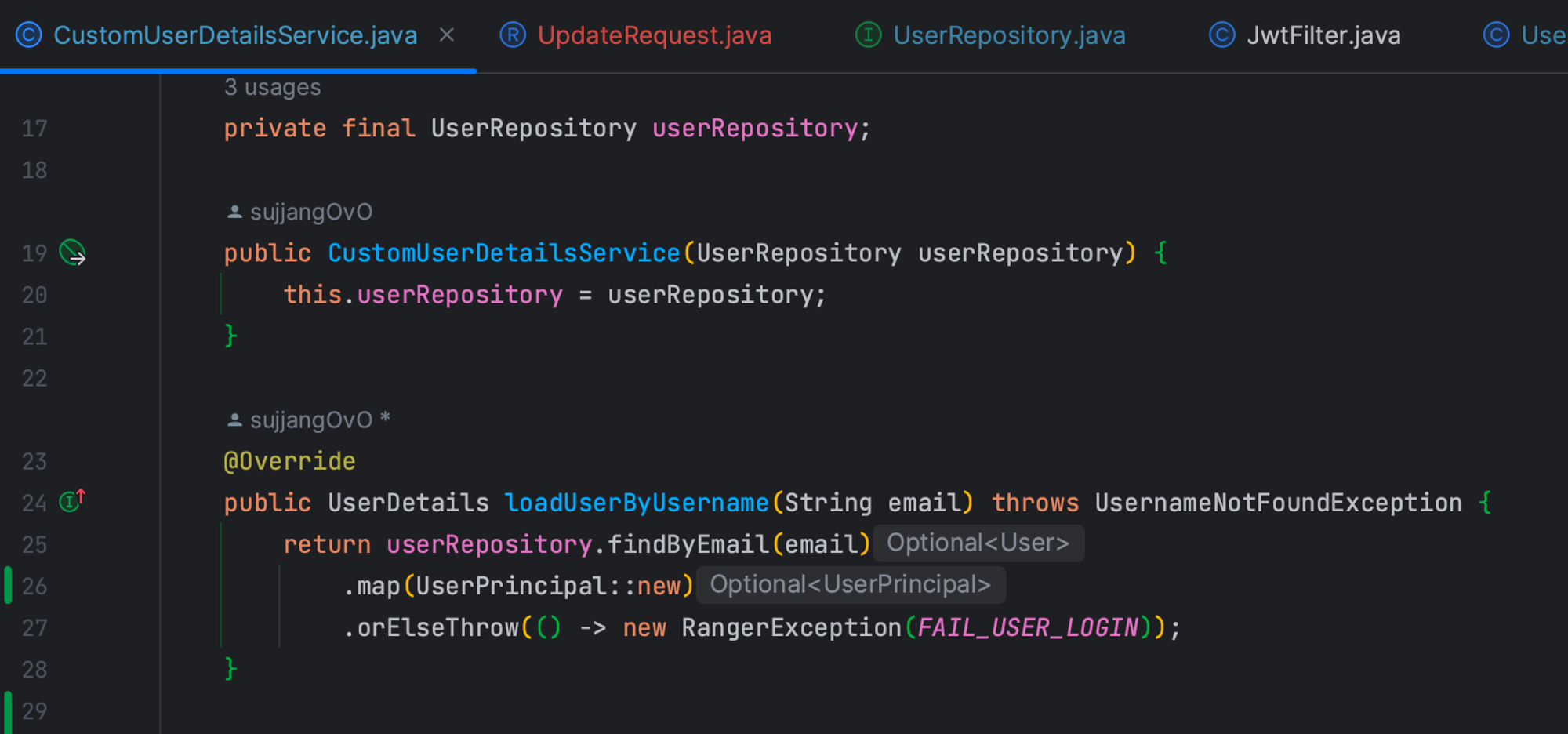 그래서 그냥 아무 생각없이 JwtTokenProvider에 CustomerUserDetailsService를 넣고 loadByUserName를 사용하면 되겠지 라고 생각했다