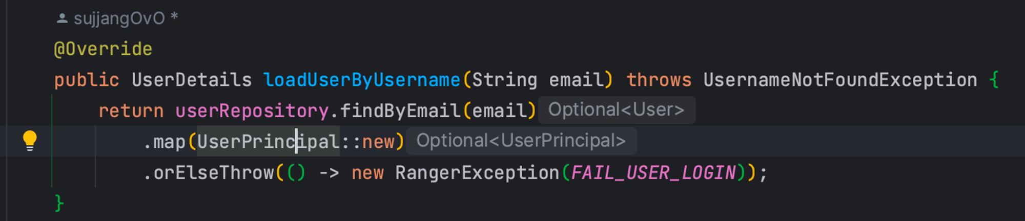 UserDetails user = userDetailService.loadUserByUsername(username); 의 반환 타입이 UserDetails인걸 보고 UserDetails를 구현한 UserPrincipal에 정답이 있나..? 하고 쓱 쳐다봤다