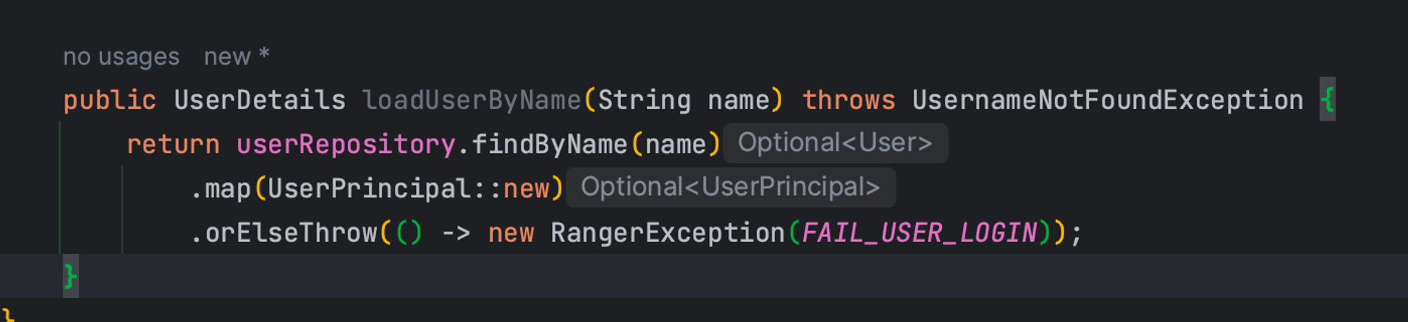 참고로 아래와 같이 loadUserByName은 @Override가 아니라 내가 정의한 메소드다.