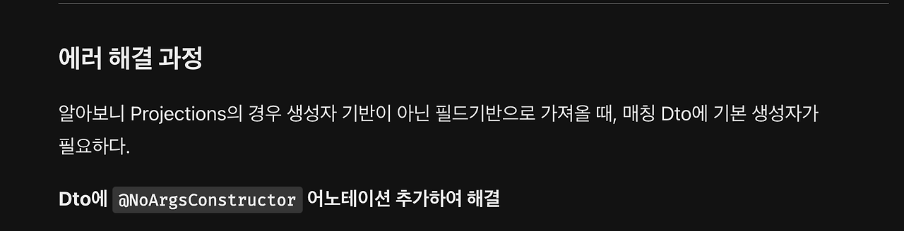 해당 오류는 dto와 entity 사이 간극이 발생했을 때 dto를 생성하지 못해 발생하는 문제라고 한다.