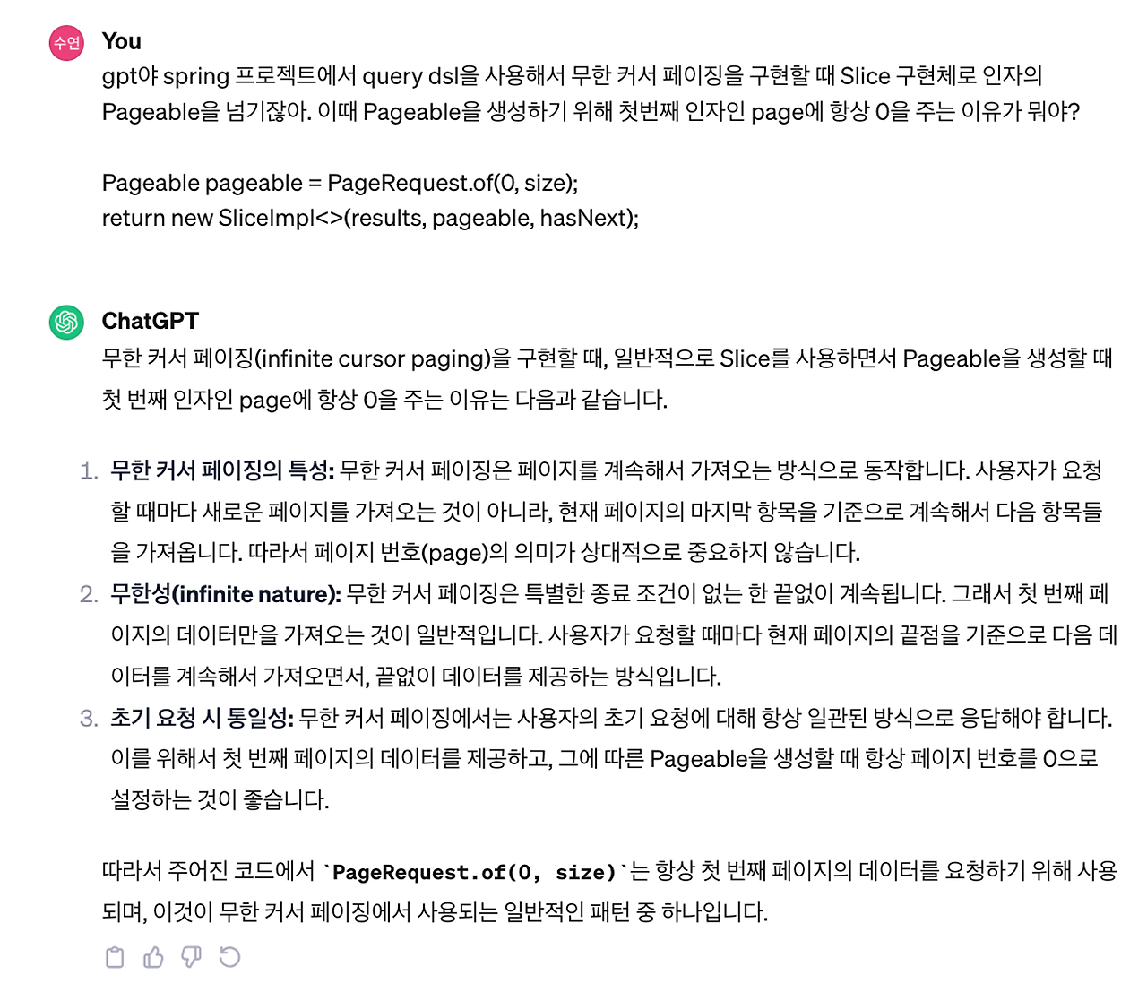 offset기반이 아닌 cursor기반의 페이징을 진행하려면 Pageable 인터페이스가 아니라 Slice 인터페이스를 사용해야 한다고 한다