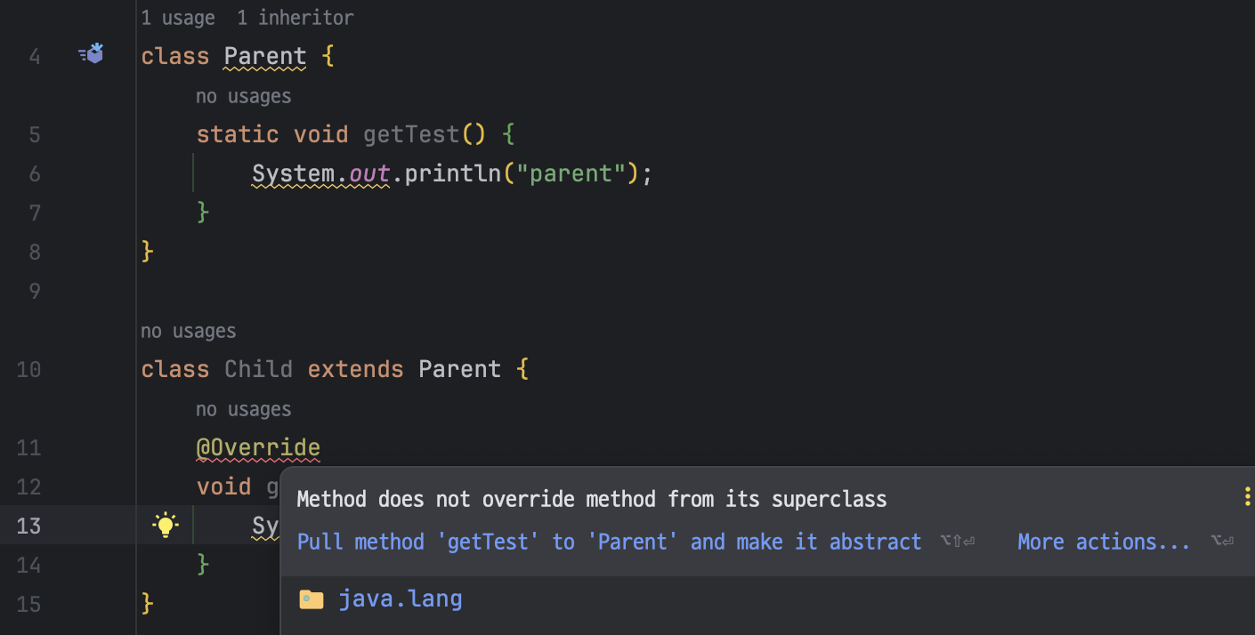 그래서 Child 클래스의 getTest메소드에 static을 추가하게 된다면 아래와 같은 경고 메시지가 사라진다