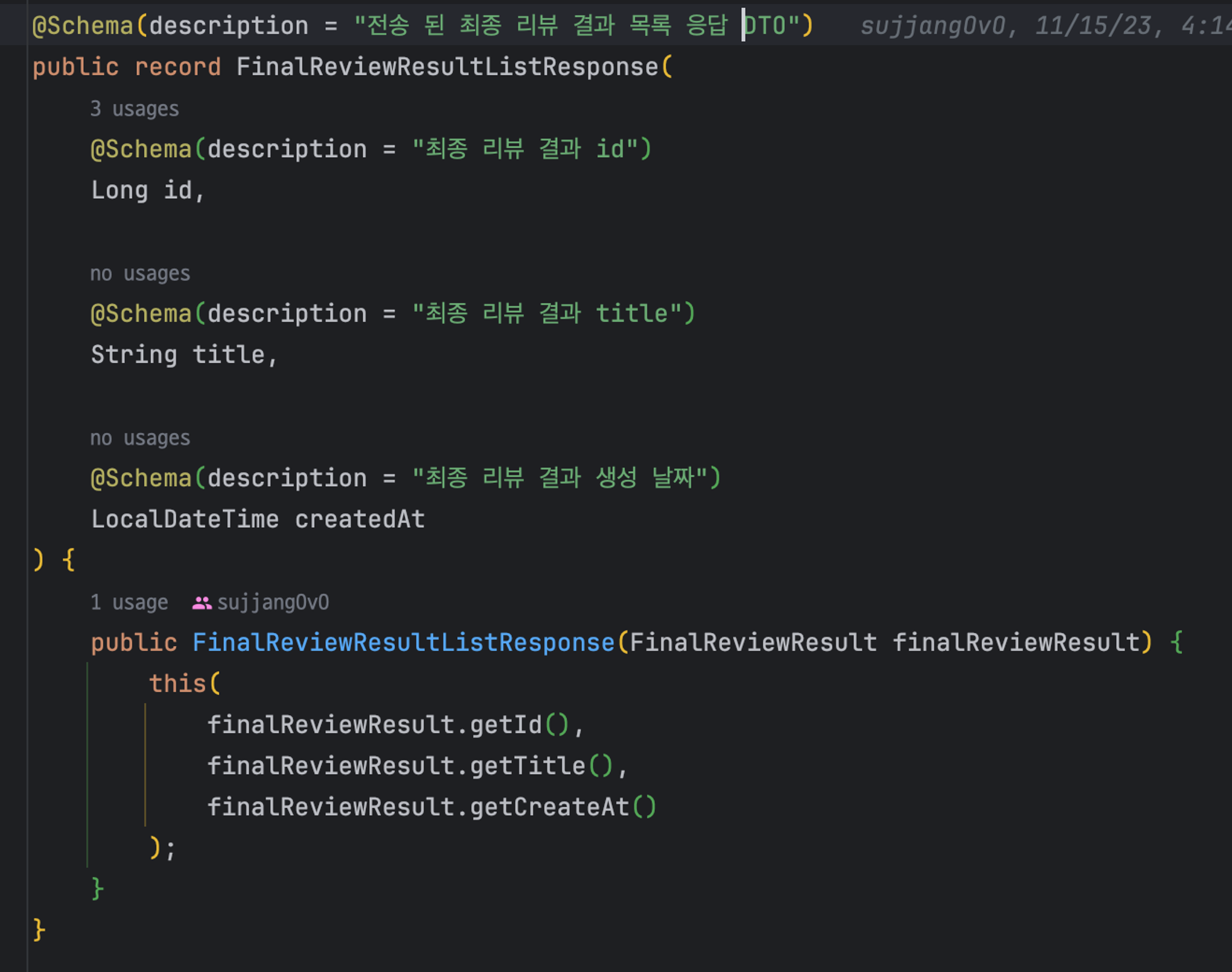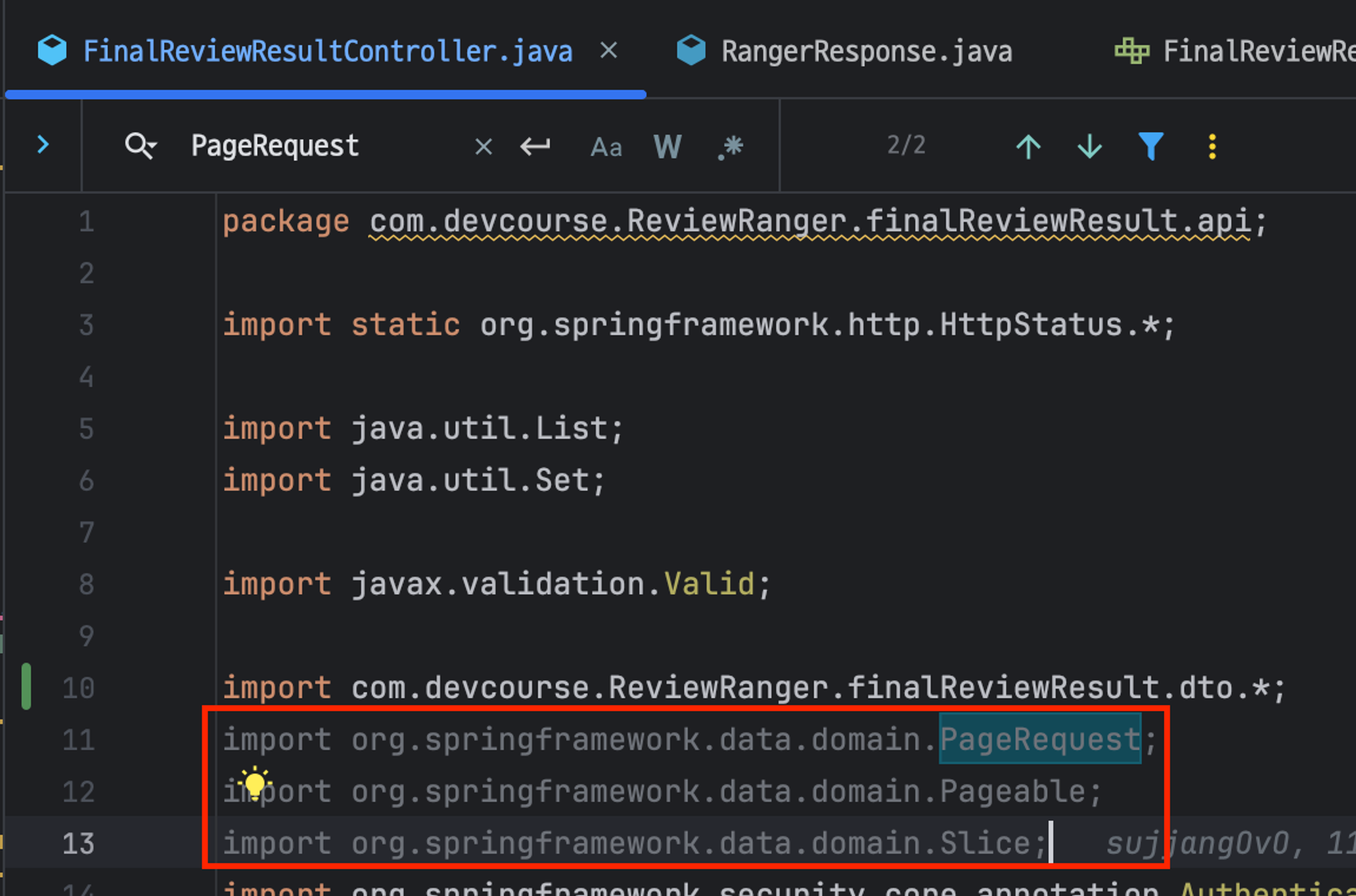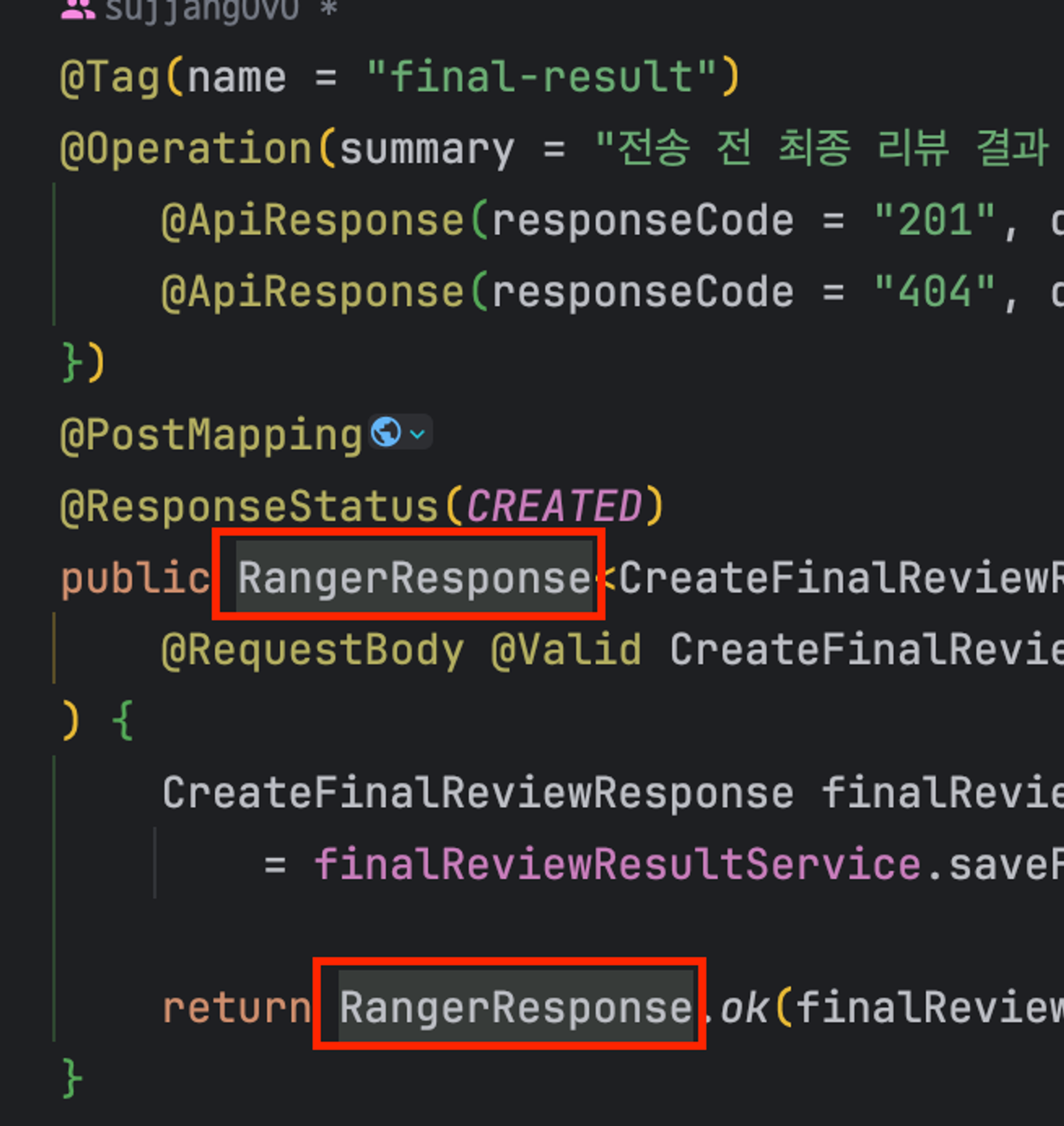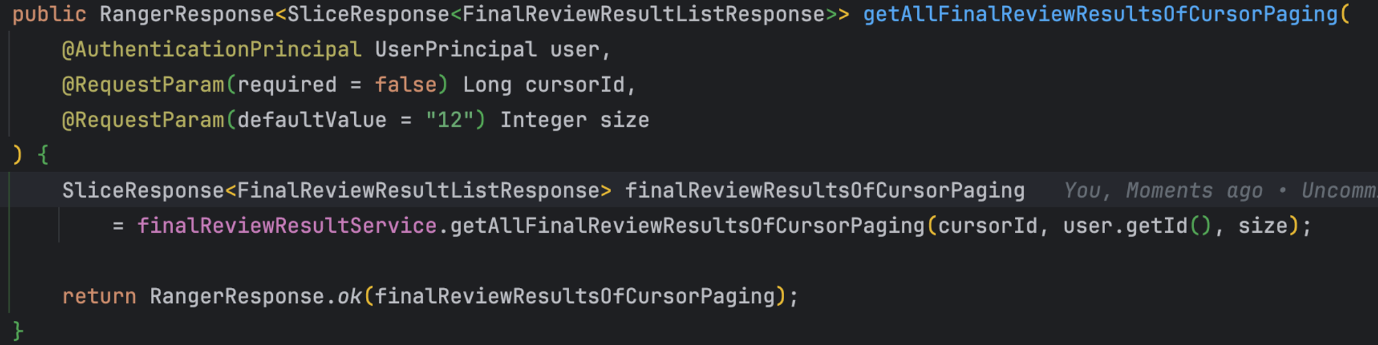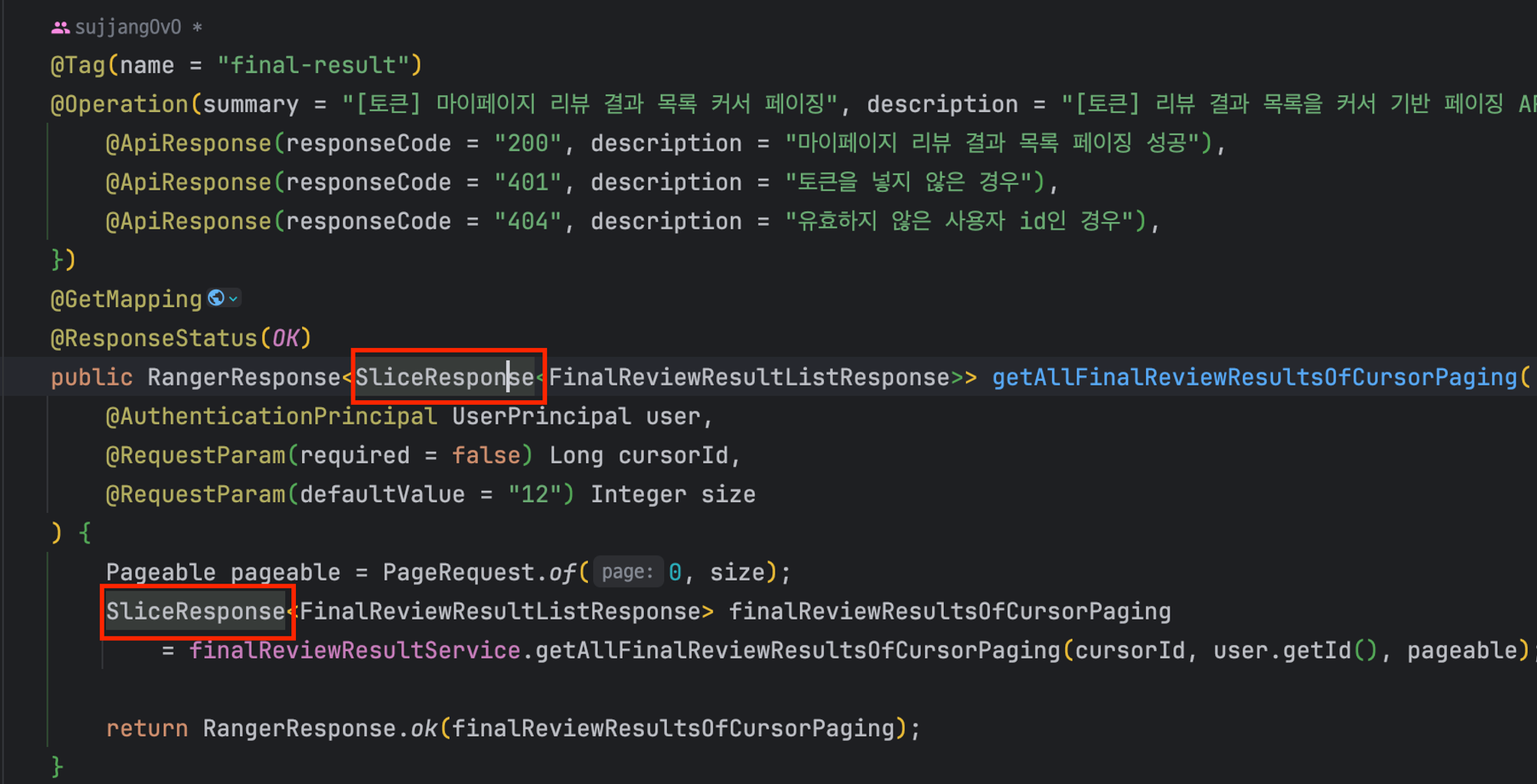 `FinalReviewResultController`에서도 Response의 데이터 타입을 `Slice`에서 `SliceResponse`로 변경해준다.