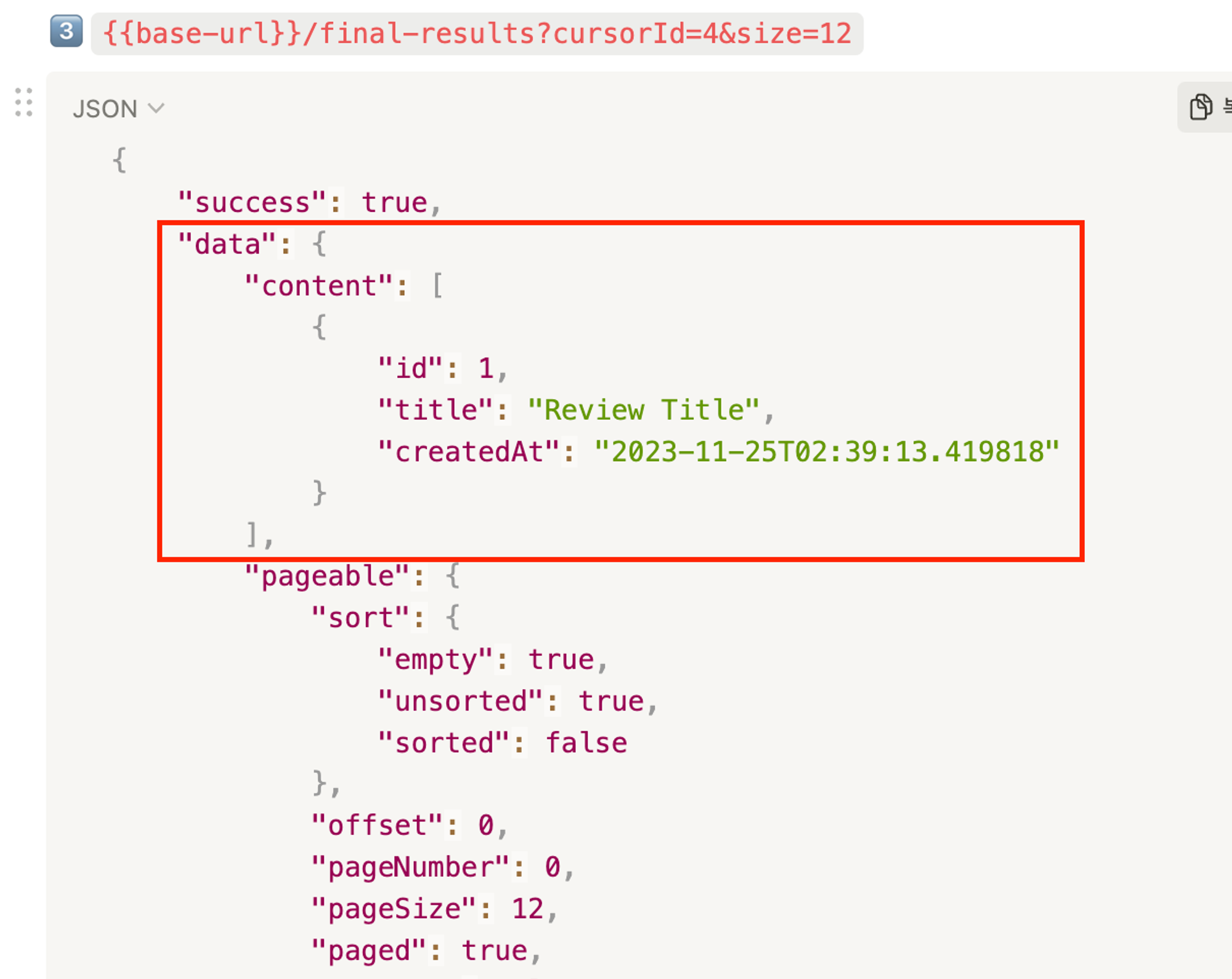 해당 DTO는 기존 Slice에서 사용하던 DTO이다 (=아래 JSON 사진의 data 빨간 블럭의 데이터)