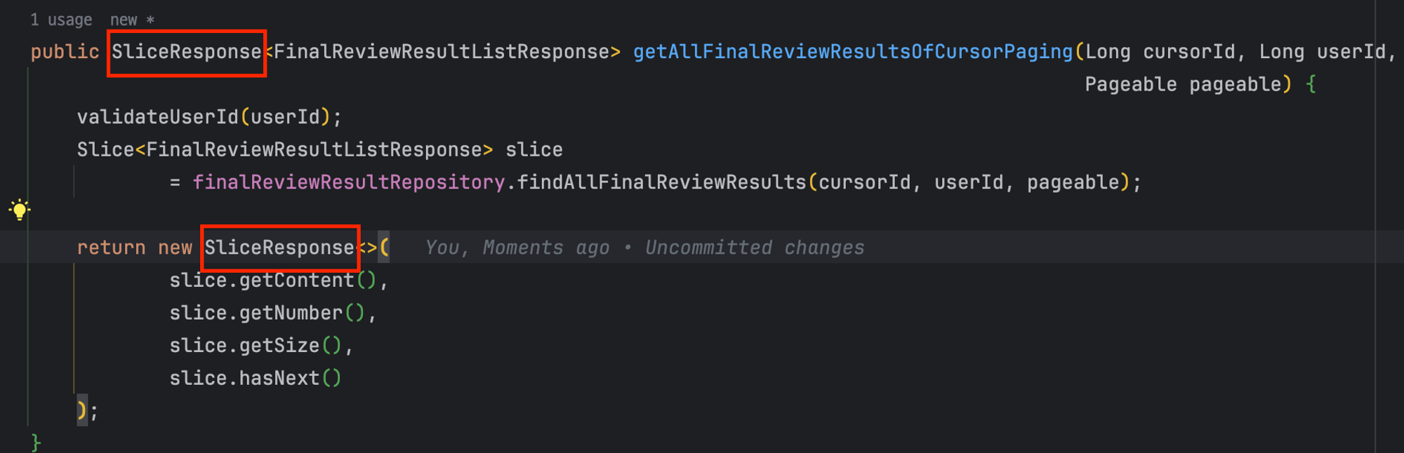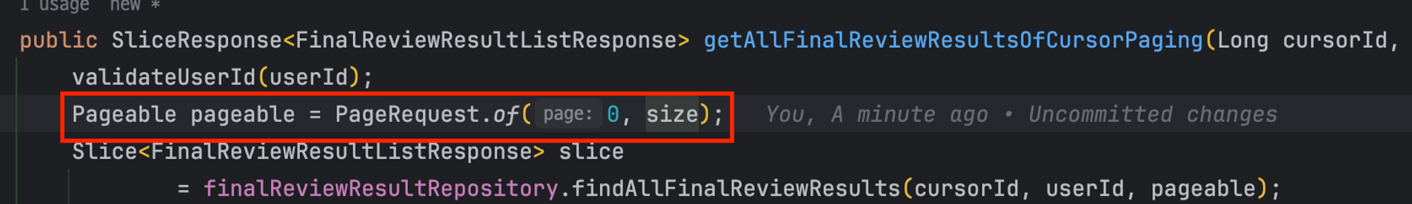 공부했던 내용을 다시 돌아보면 단순히 `Slice` 객체를 커서 페이징에 사용하지 않으니 리팩토링이 필요하다 라고 작성 해놨다