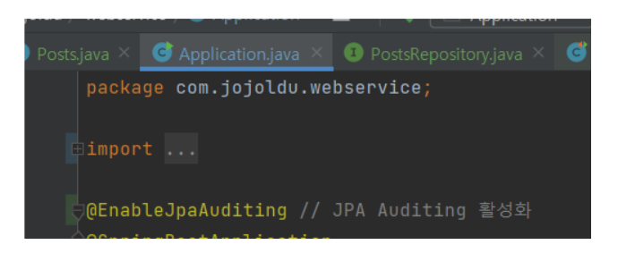 위와 같이 JPA Auditing 어노테이션들을 모두 활성화 시키기 위해 Application 클래스에 활성화 어노테이션(@EnableJpaAuditing)을 추가해줍니다!