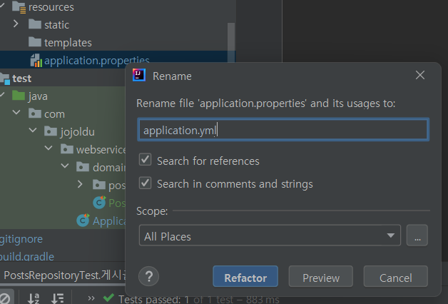 이를위해 application.propertites 파일을 application.yml 파일로 변경시켜주어야 합니다.