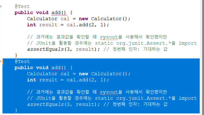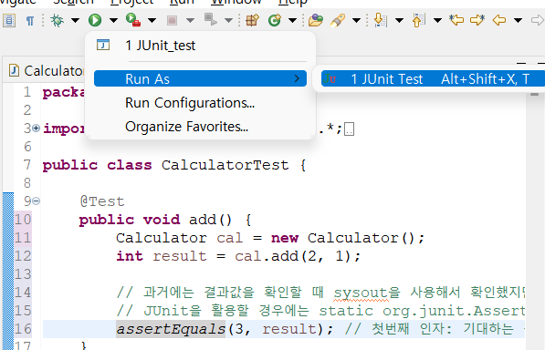 // JUnit을 활용할 경우에는 static org.junit.Assert.*을 import 하면 assertEquals()를 이용할 수 있다.