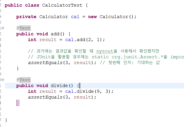 assertEquals(3, result); // 첫번째 인자: 기대하는 값