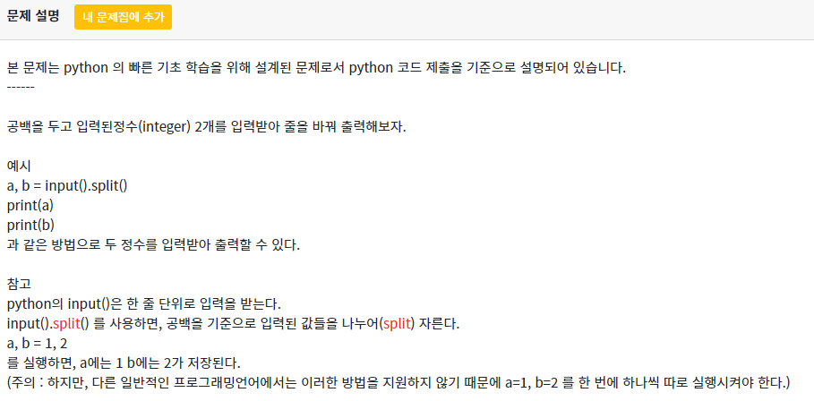 6015 : [기초-입출력] 정수 2개 입력받아 그대로 출력하기2(설명)(py)
