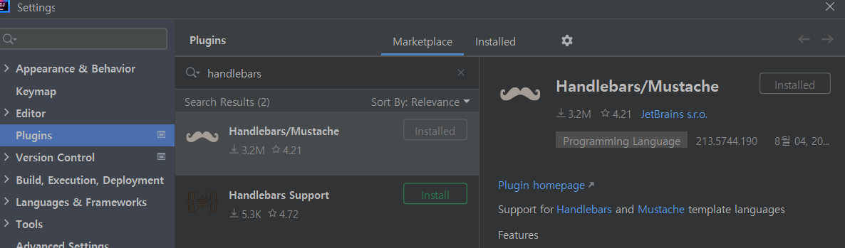 IntelliJ를 사용중이라면 Handlebars 플러그인을 설치하여 문법체크 등과 같은 많은 지원을 받을 수 있습니다.
