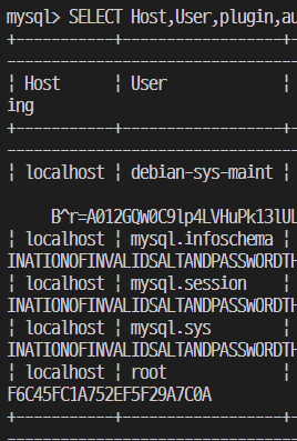 mysql> SELECT Host,User,plugin,authentication_string FROM mysql.user;