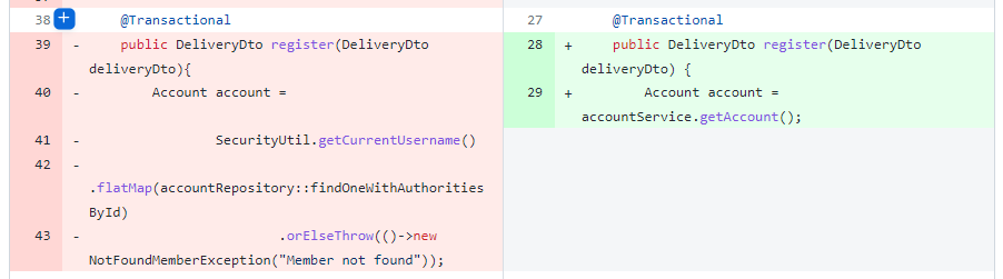2. Account를 가져오는 부분이 많이 중복되어 AccountService에서 getAccount 메소드를 통해 가져올 수 있도록 하였고 AccountService에서 StoreService를 참조하여 생기는 순환참조 문제를 해결