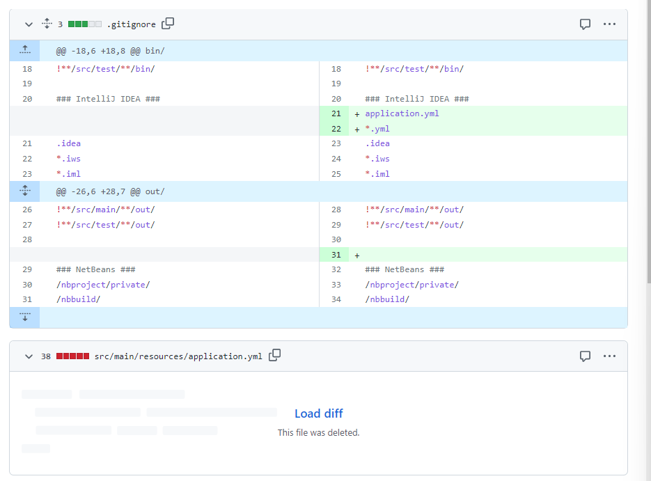그럼 결과적으로 원격저장소에 노출되었던 application.yml 파일이 삭제되었고 .gitignore 파일이 업데이트 된 모습을 볼 수 있다.