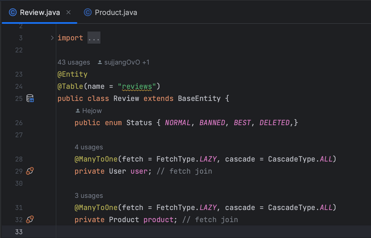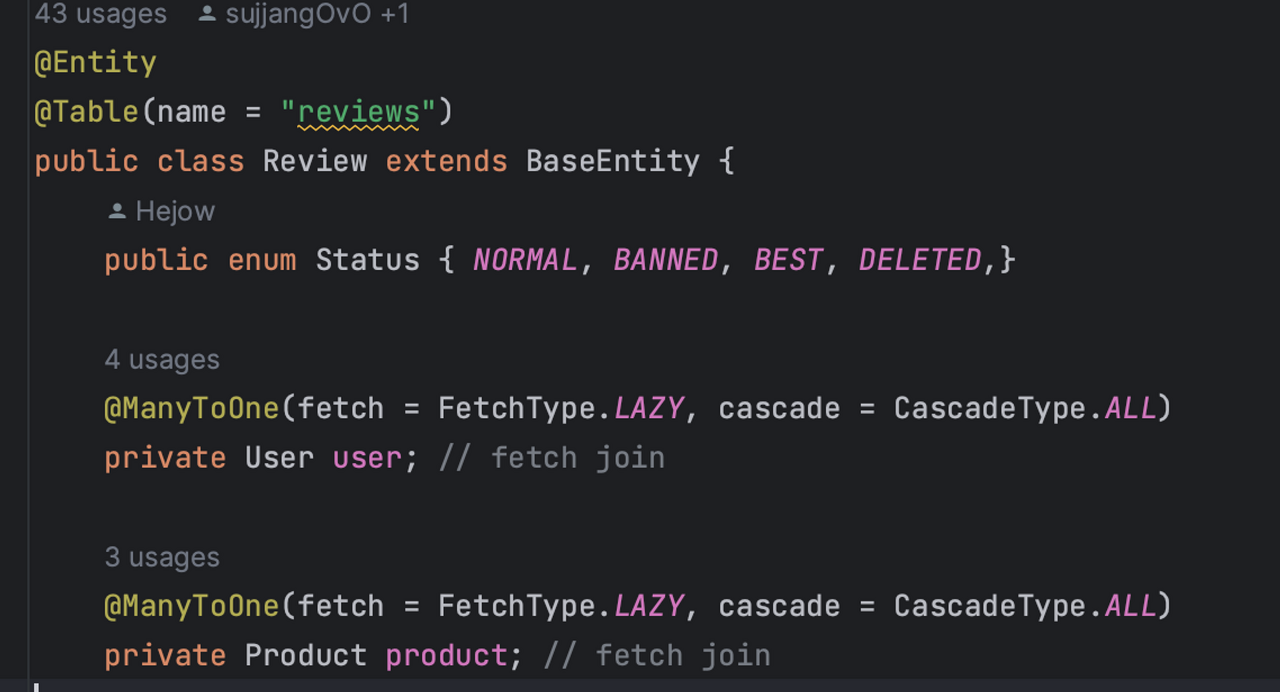 상품은 여러 개의 리뷰를 가질 수 있으며 사용자는 여러 개의 리뷰를 작성 할 수 있어 위와 같은 연관 관계가 맺어진다.