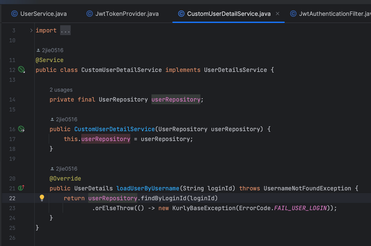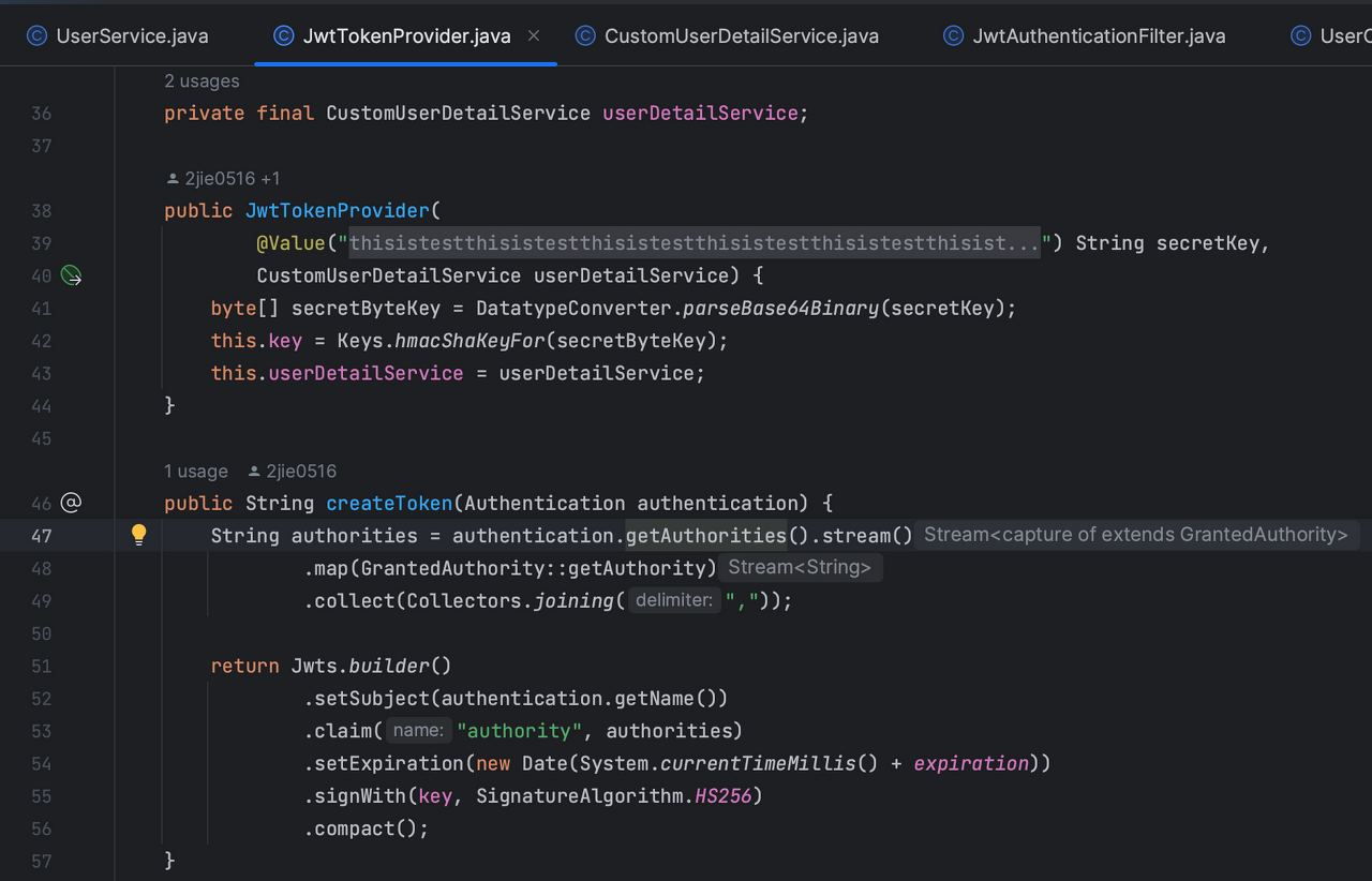 createToken에서 CustomUserDetailService의 getAuthentication 메서드 호출