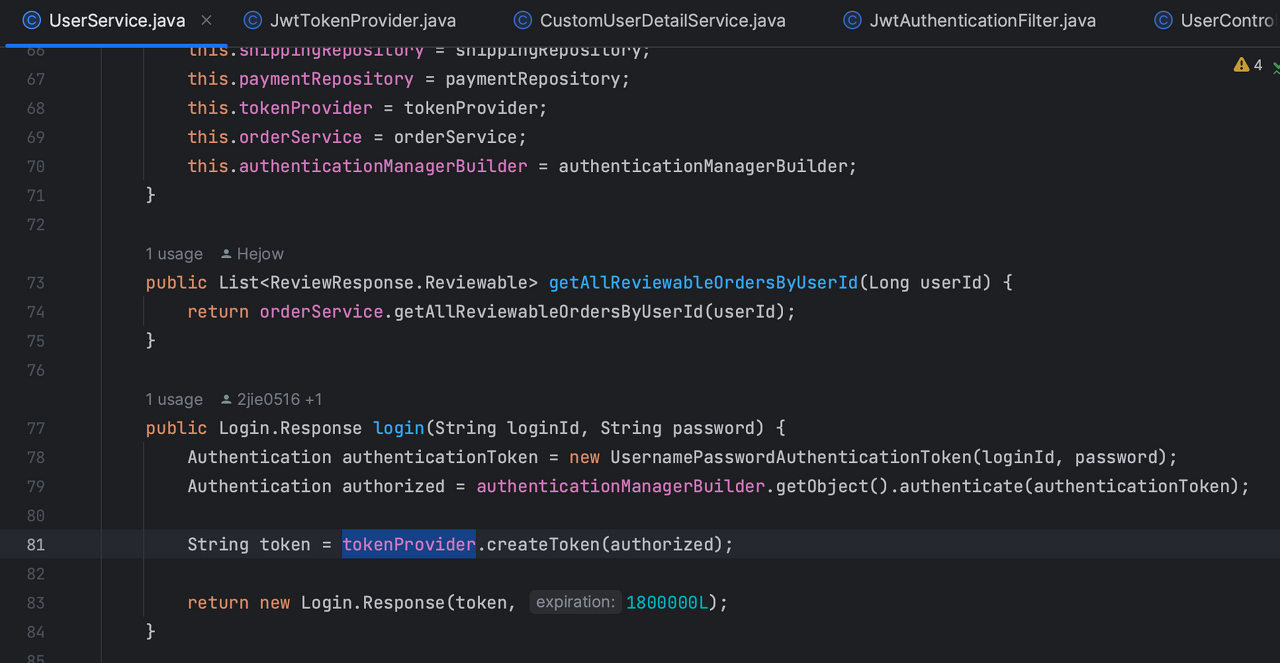 UserService의 login에서 JwtTokenProvider 메서드 호출