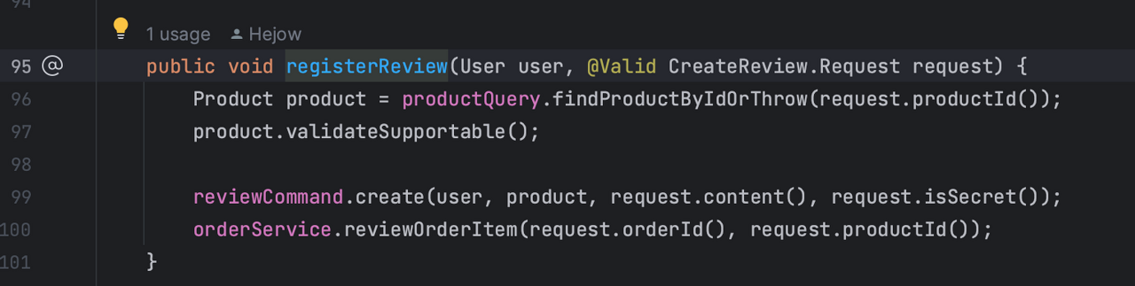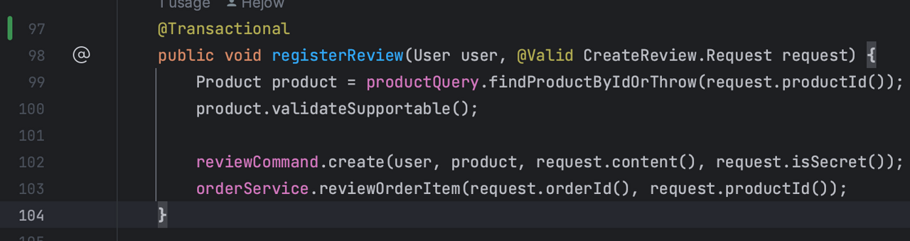 상품에 대한 review를 작성하는 api 기능 테스트를 진행하던 와중이었다. (/products/review, 사진의 서비스 메서드 호출)