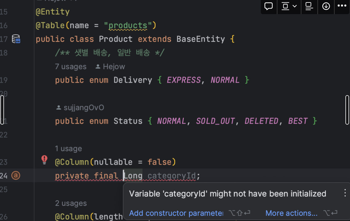 만약, Entity 필드에 final 키워드를 붙이게 된다면 위 그림과 같은 에러 메시지가 뜬다.